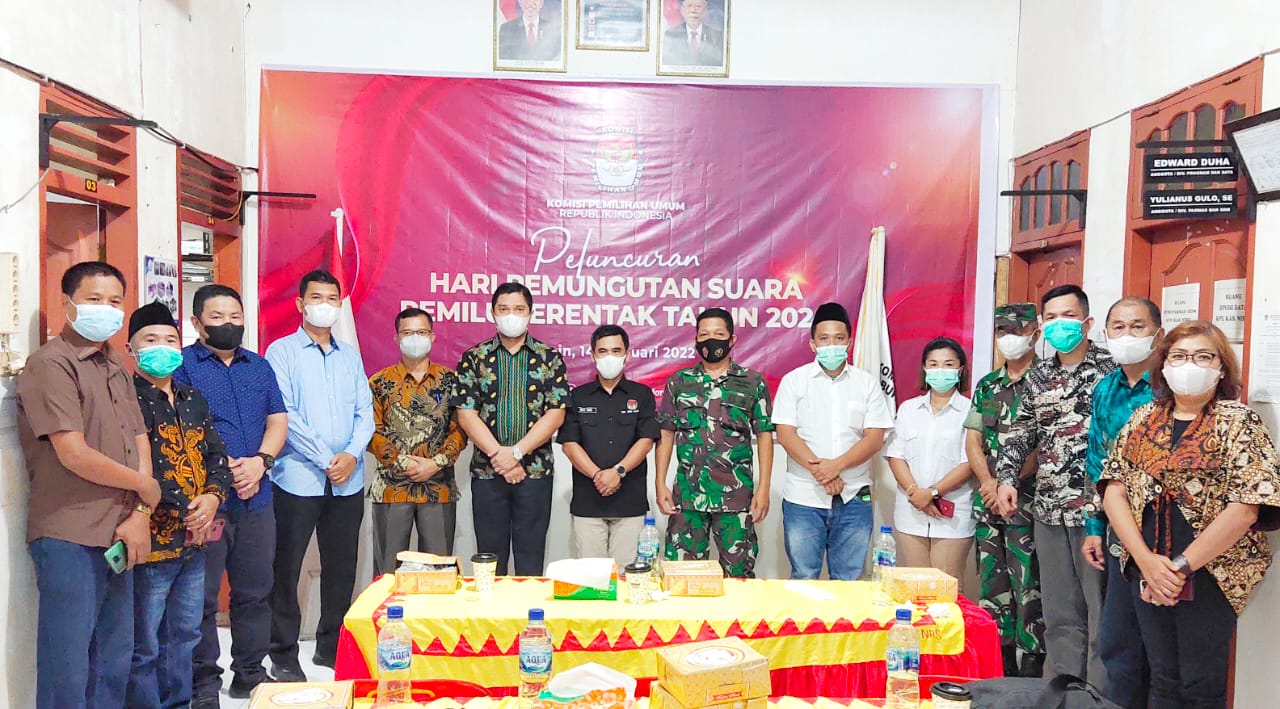 Foto: Anggota Bawaslu Nias Selatan ibu Alismawati Hulu, S.Pd (Kordiv HPPS) bersama Anggota KPU Nias Selatan dengan para peserta yang menghadiri kegiatan peluncuran hari pemungutan suara Pemilu Serentak 14 Februari 2024 melalui youtube di Kantor KPU Nias Selatan, Telukdalam (14/2/2022).