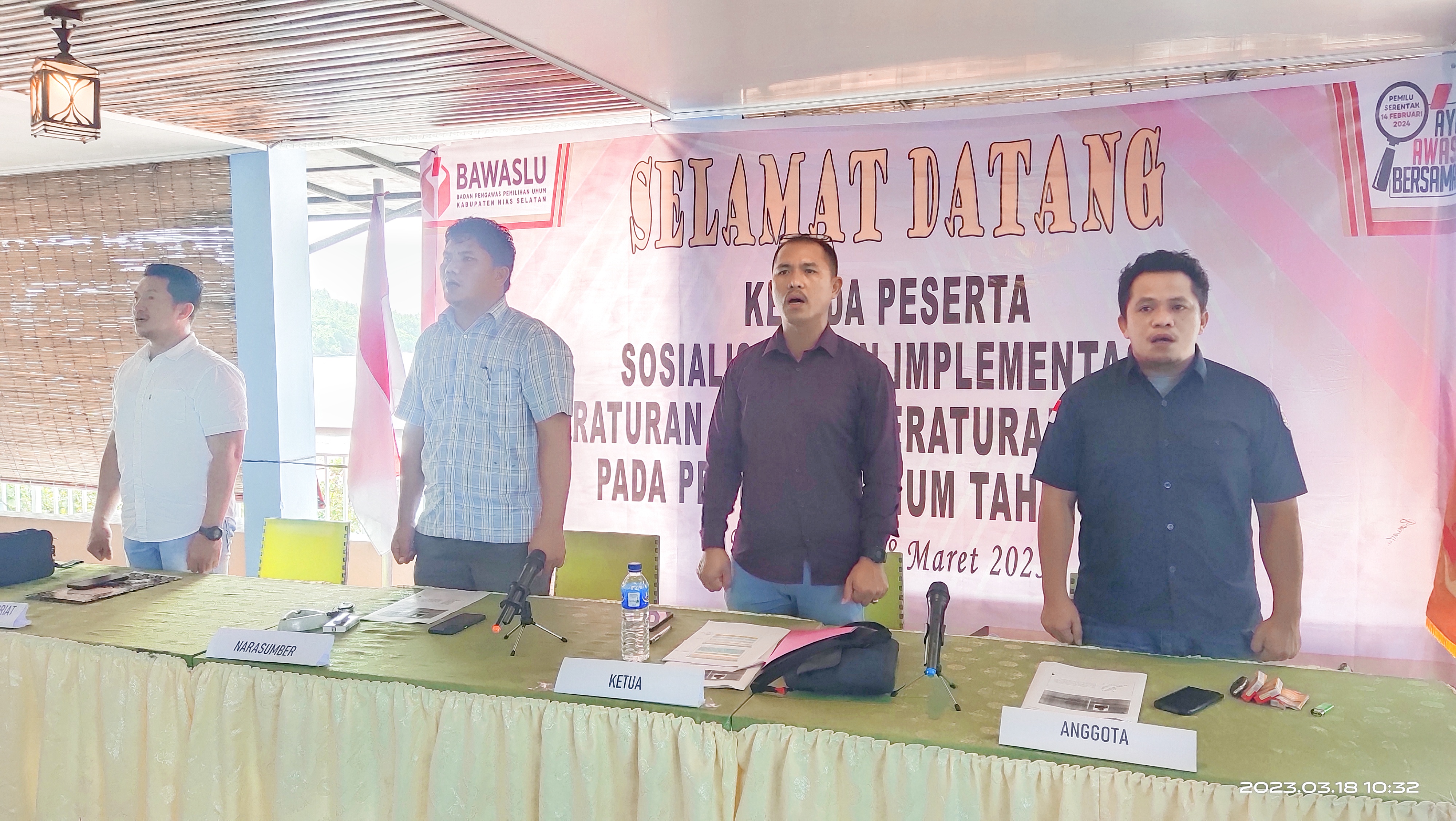 Telukdalam_BawasluNisel – Bawaslu Kabupaten Nias Selatan memberikan pemahamam tentang peraturan dan non peraturan Bawaslu kepada Panwaslu Kecamatan Kordiv HP2H dan P3S melalui Sosialisasi dan Impelentasi Peraturan dan Non Peraturan Bawaslu pada pemilihan umum tahun 2024 yang dilaksanakan di aula Sem Hotel (18/03/23). Hal itu dilakukan untuk memberikan penguatan pada Panwaslucam dalam melaksanakan tugas pengawasan sesuai dengan peraturan dan perundang-undangan yang berlaku.
