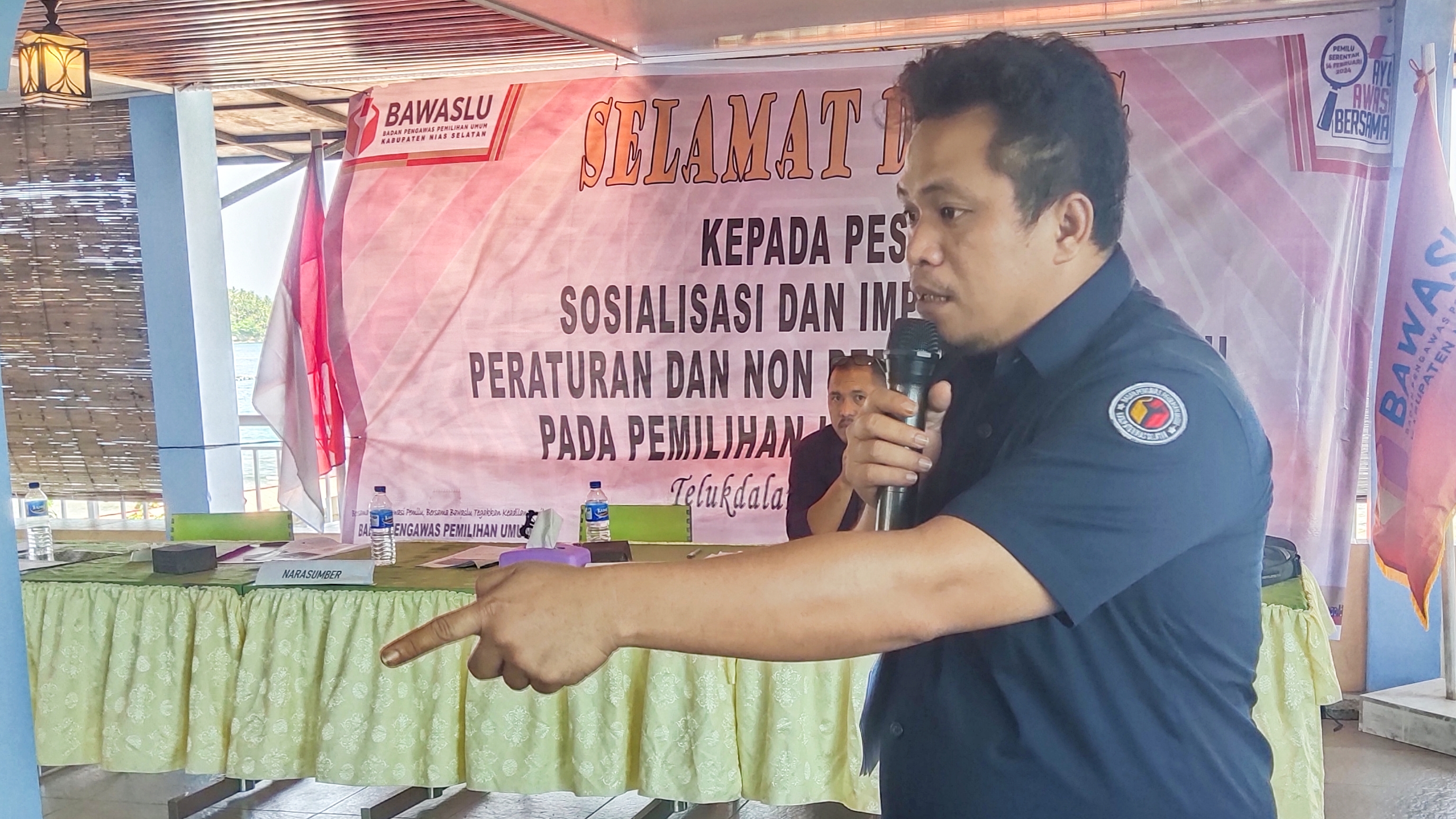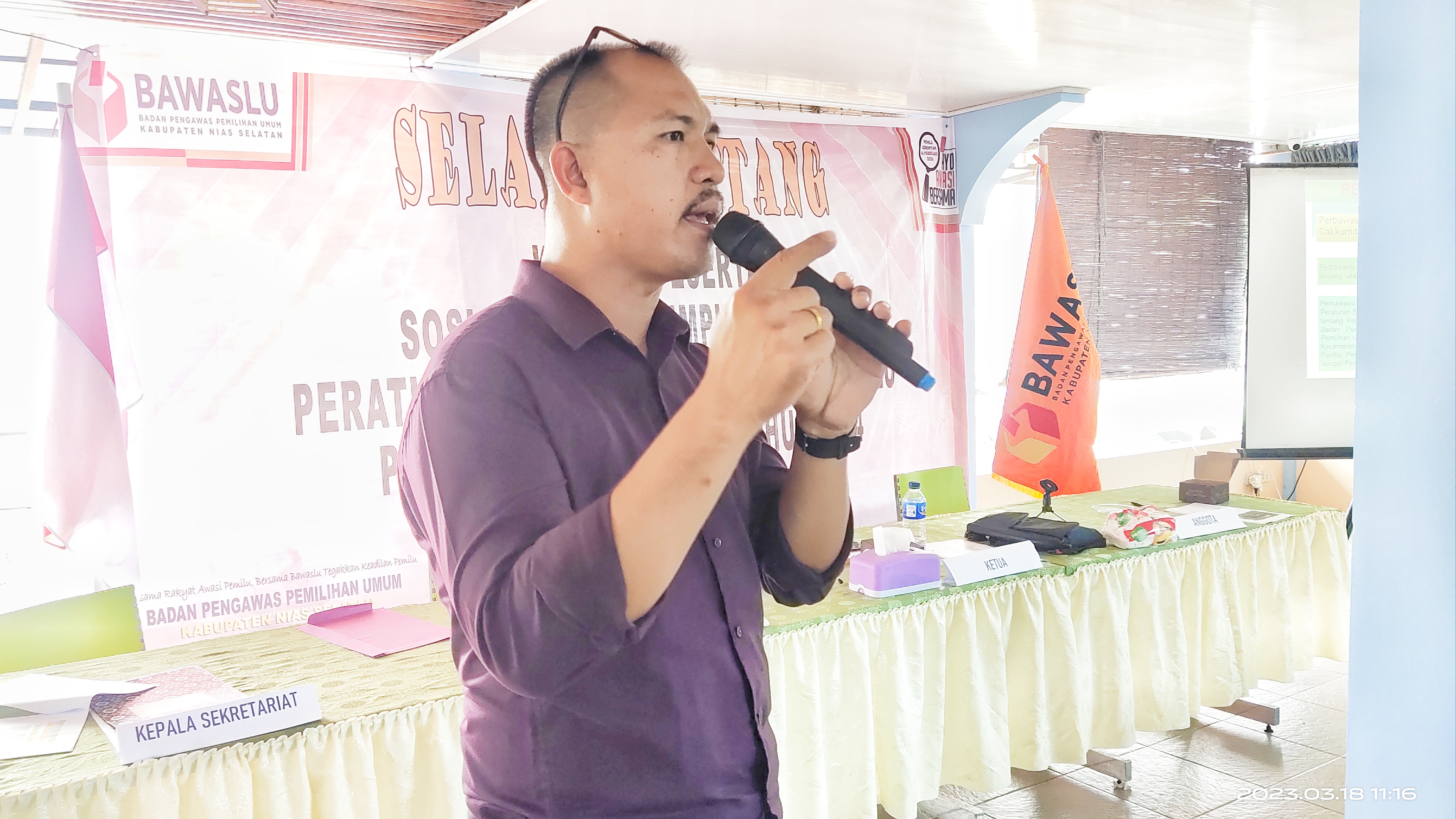 Foto: Ketua Bawaslu Kabupaten Nias Selatan Harapan Bawaulu saat menyampaikan arahan dan bimbingan sekaligus membuka kegiatan sosialisasi dan implementasi peraturan dan non peraturan Bawaslu.