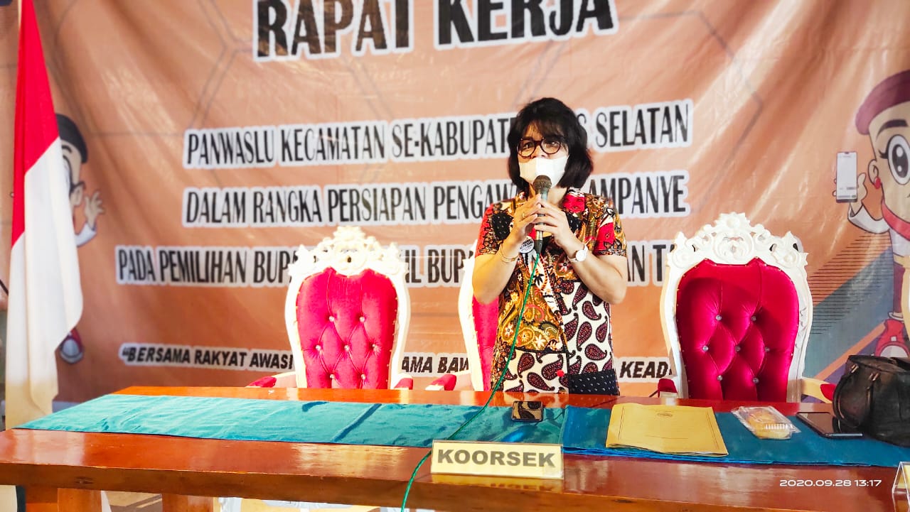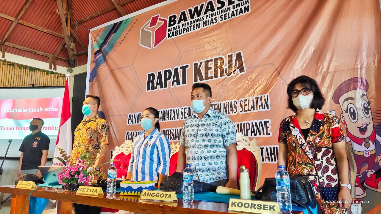 Niasselatan, Bawaslu - Badan Pengawas Pemilihan Umum Kabupaten Nias Selatan melaksanakan rapat kerja (raker) persiapan pengawasan tahapan kampanye bersama Panwaslu Kecamatan yang dibuka oleh Ketua Bawaslu Nisel, Alimawati Hulu di Aula Hotel Baloho Beach (28/09). Raker dilaksanakan secara bertahap selama 3 hari dengan memperhatikan protokol kesehatan tentang pencegahan penyebaran Covid-19 dimana jumlah peserta Panwaslu Kecamatan dan Koorsek sebanyak 140 orang.
