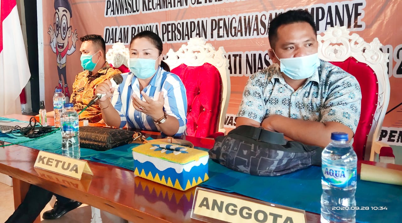 Koordiv PHL Bawaslu Nisel, Pilipus F. Sarumaha memaparkan tugas dan fungsi Panwaslu Kecamatan melakukan pengawasan dalam materi yang disampaikannya. Pilipus Sarumaha menegaskan bahwa Panwaslu Kecamatan wajib memperhatikan hal-hal yang perlu diawasi dalam kampanye yakni melakukan check dan reecheck terhadap daftar nama tim dan petugas kampanye pasangan calon, mengalisis materi kampanye paslon yang mengandung rasis. Mengawasi proses pertemuan terbatas dan tatap muka masing-masing paslon. Mengawasi kampanye melalui media sosial. Mengawasi setiap paslon jika menggunakan fasilitas negara. Mengawasi kampanye yang difasilitasi KPU. Mengawasi Iklan dari Media cetak, elektronik atau online yang tidak diperkenaankan untuk mempromosikan salah satu paslon. Mengawasi proses persiapan dan pelaksanaan kampanye di Kecamatan, Panwaslu kecamatan diperkenankan membubarkan kampanye di kecamatannya masing-masing, apabila paslon tidak memberitahukan jadwal kampanye kepada jajaran Bawaslu melalui surat pemberitahuan minimal 1 hari sebelum pelaksanaannya. Anggota DPRD yang ikut kampanye wajib menunjukkan surat izin mengikuti kampanye yang ditanda-tangani oleh Ketua DPRD dan Pimpinan Fraksi. Pengawasan lokasi pemasangan Alat Peraga Kampanye (APK). Paslon tidak diperkenankan memasang APK di gedung pemerintah, Kepala Desa, BUMN dan BUMD. Pengawasan di lokasi pelaksaan kampanye, pelaksanaan kampanye harus patuh terhadap protokol kesehatan tentang pencegahan penyebaran Covid-19. Jumlah peserta kampanye paling banyak 50 orang. Jenis APK harus sesuai dengan kriteria yang telah ditetapkan oleh KPU Nias Selatan. Paslon dilarang melibatkan PNS, Pejabat, BUMD/BUMN, Anggota TNI-Polri, Kepala Desa, Balita, Anak-anak, dan Orang Tua Lanjut Usia. kegiatan yang dilarang pada masa kampanye yakni rapat umum, kegiatan kebudayaan, kegiatan olahraga, perlombaan, kegiatan sosial bazzar atau donor darah dan lain sebagainya, peringatan HUT Parpol.