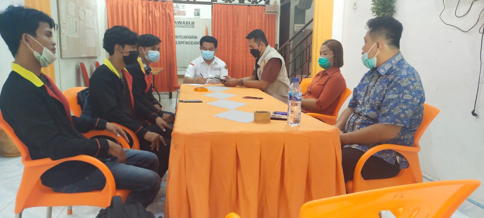 Telukdalam - Bawaslu, Badan Pengawas Pemilihan Umum Kabupaten Nias Selatan menerima kunjungan Badan Eksekutif Mahasiswa (BEM) Sekolah Tinggi Ilmu Hukum (STIH) Nias Selatan di Kantor Bawaslu Kabupaten Nias Selatan, Kamis (7/10/2021).