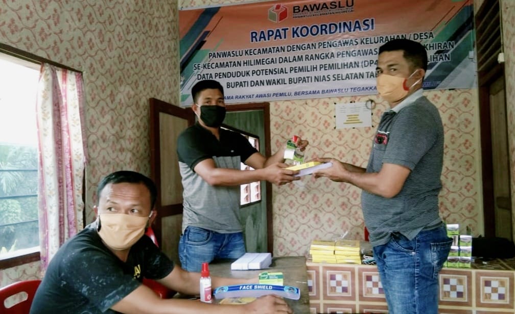 Foto: Penyerahan APD Oleh Ketua Panwascam Hilimegai Kepada Panwaslu Desa (PKD)