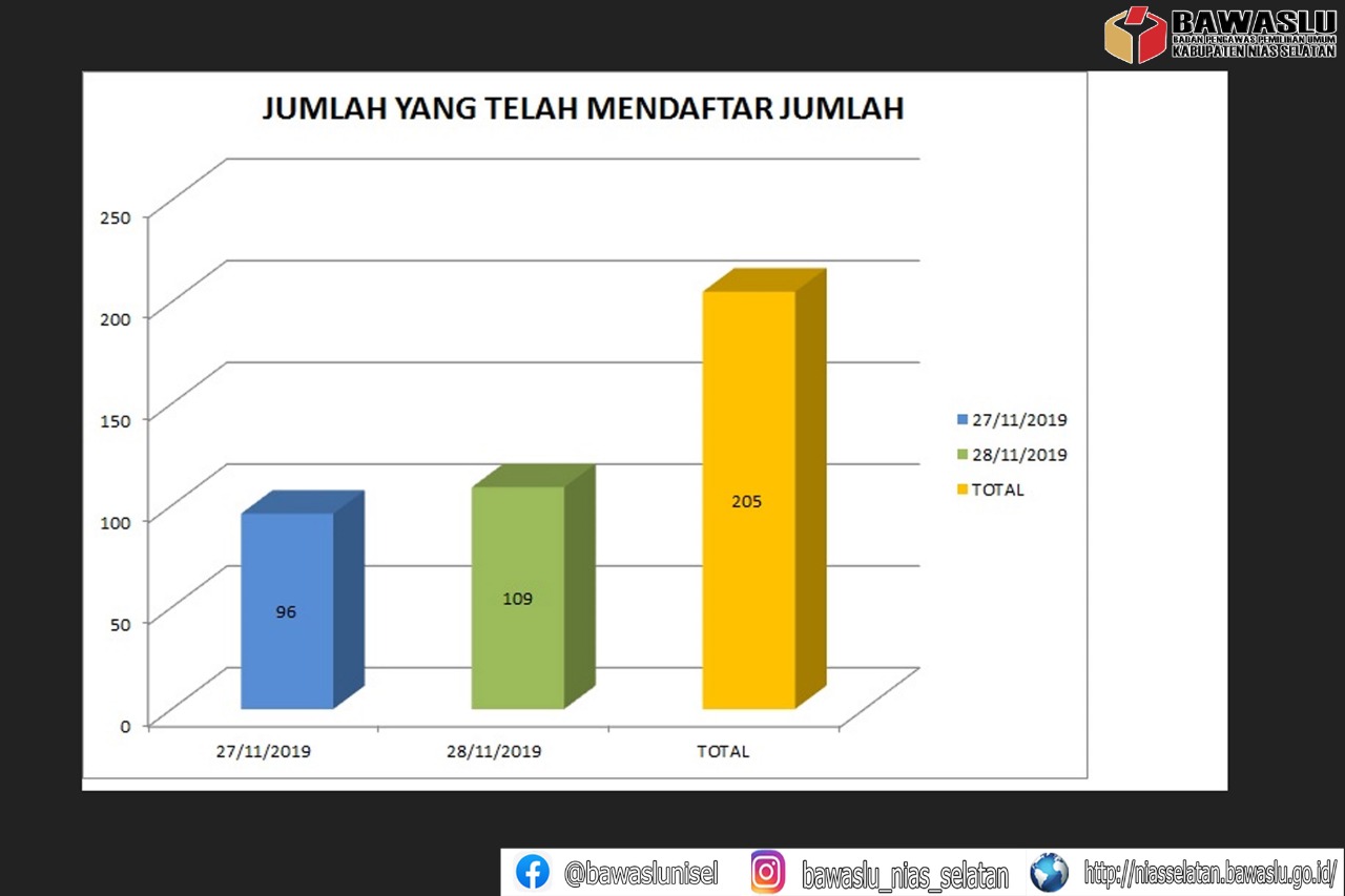 Bawaslu, Nisel - Hari kedua pendaftaran Panwascam di Kantor Bawaslu Kabupaten Nias Selatan meningkat dari hari sebelumnya dimana pelamar yang sebelumnya sebanyak 96 orang, di hari kedua pelamar meningkat menjadi 109 orang yang terbagi atas 98 orang laki-laki dan 11 orang perempuan yang tersebar dari 35 Kecamatan di Kabupaten Nias Selatan.