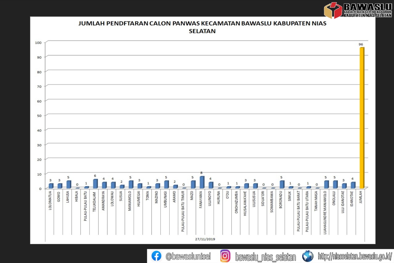 Nisel-Bawaslu- Hari pertama pendaftaran Panwascam Pilkada 2020, Kantor Bawaslu Nias Selatan diserbu ratusan peserta dari 35 Kecamatan di Nias Selatan yang ingin menyerahkan berkas persyaratan seleksi penerimaan anggota panwascam pada pilkada 2020 mendatang. dari ratusan peserta tersebut, sebanyak 96 peserta lolos pendaftaran berkas. namun peserta lainnya masih harus menunda pendaftaran mereka pada hari kedua dikarenakan berkas yang dibawa tidak sesuai dengan persyaratan yang diumumkan oleh Bawaslu Nias Selatan Melalui Surat Undangan di Kecamatan, Papan Pengumuman, Media Sosial, Media Cetak dan Elektronik Serta Spanduk.