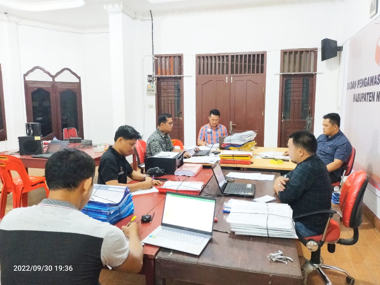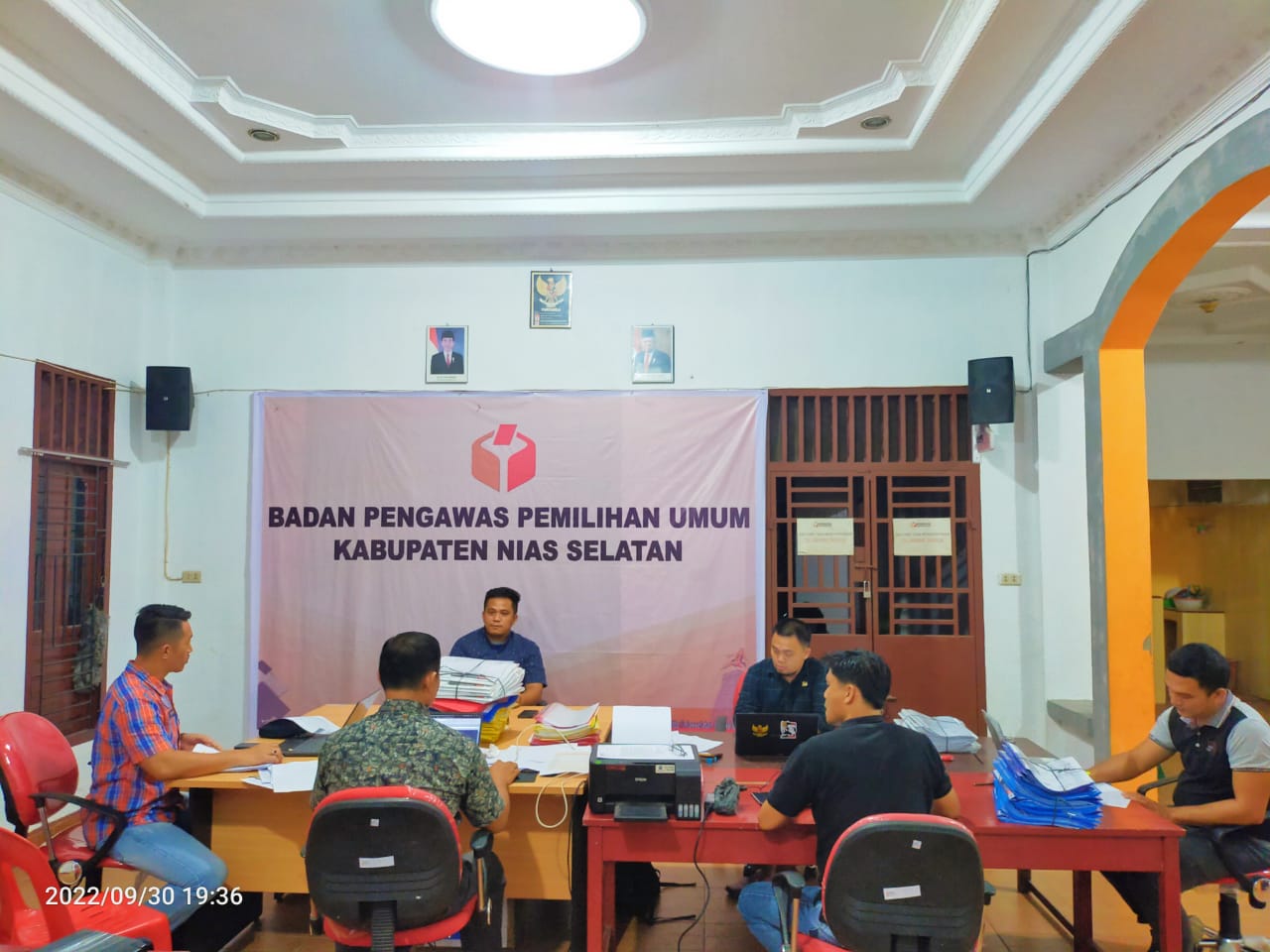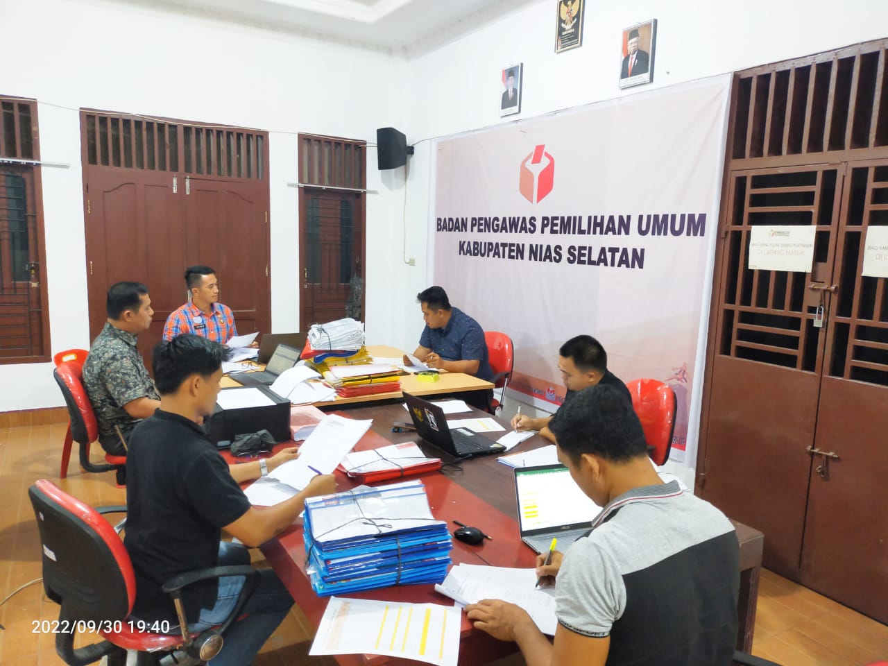 Teluk Dalam_Bawaslu_Nisel - Bertempat di ruang sidang Kantor Bawaslu Kabupaten Nias Selatan, Ketua Bawaslu Kabupaten Nias Selatan Harapan Bawaulu bersama Kepala Sekretariat Bawaslu Nias Selatan Sarso F. Sarumaha dan para Kasubbag di lingkungan Sekretariat Bawaslu Kabupaten Nias Selatan melaksanakan rapat pelaporan hasil verifikasi administrasi calon anggota Panwaslu Kecamatan di lingkungan Kabupaten Nias Selatan, Jumat (30 September 2022).