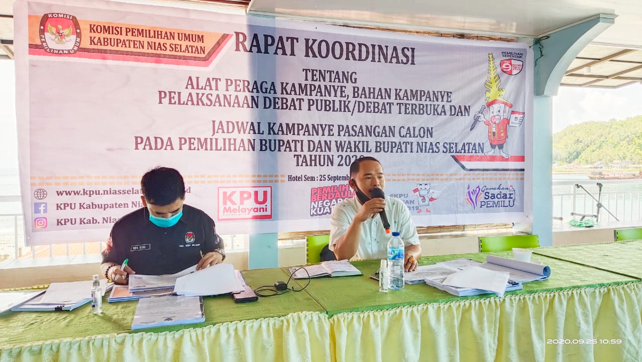 Rakor tersebut membahas tentang Alat peraga kampanye, bahan kampanye, pelaksanaan debat publik/debat terbuka dan jadwal kampanye pasangan calon pada pemilihan Bupati dan Wakil Bupati Nias Selatan.