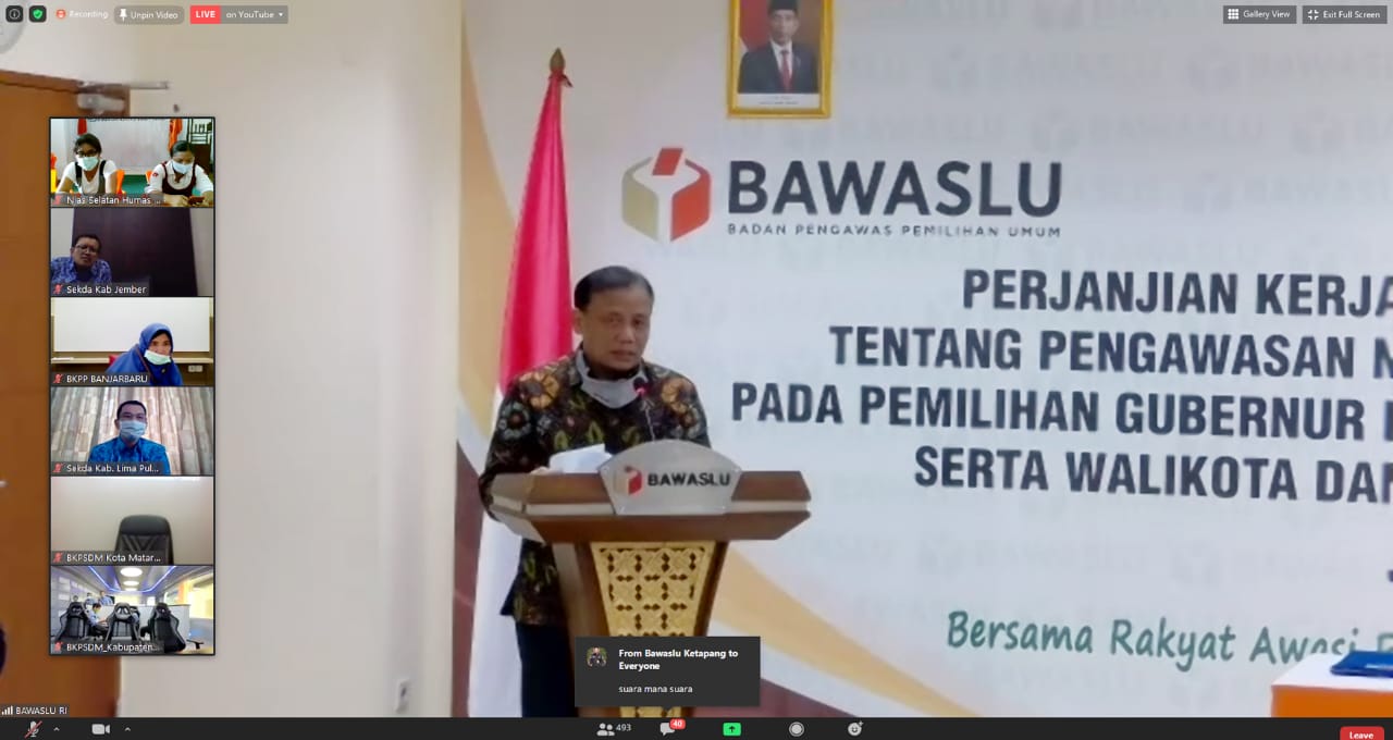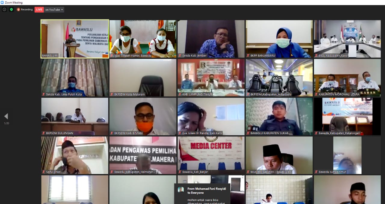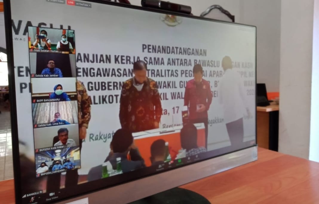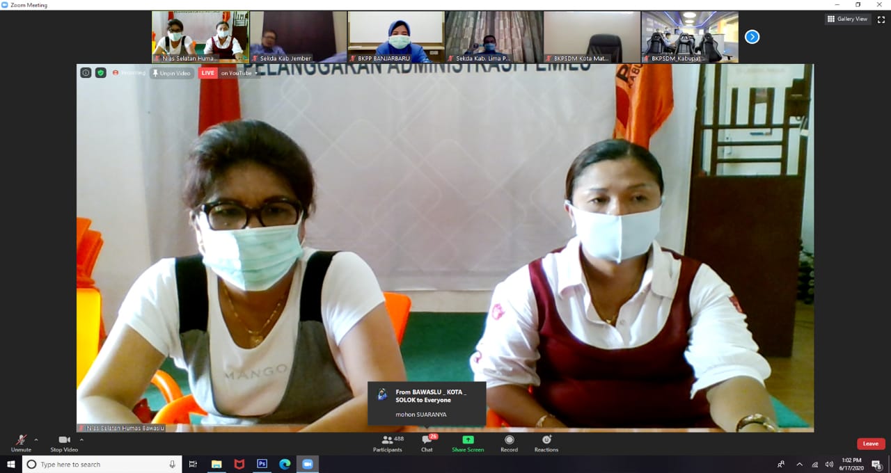 Niasselatan, Bawaslu - Ketua Bawaslu Nias Selatan, Ibu Alismawati Hulu dan Koordinator Sekretariat Bawaslu Nias Selatan, Ibu Murniati Dakhi mengikuti Kegiatan Penandatanganan perjanjian kerjasama antara Bawaslu dan KASN tentang pengawasan Netralitas ASN pada pemilihan serentak 2020 di Indonesia yang diselenggarakan oleh Bawaslu RI pada hari rabu 17 Juni 2020 pukul 12.00 WIB melalui siaran langsung (teleconfrence Video) aplikasi zoom meeting yang juga disiarkan langsung oleh akun youtube resmi Bawaslu RI.