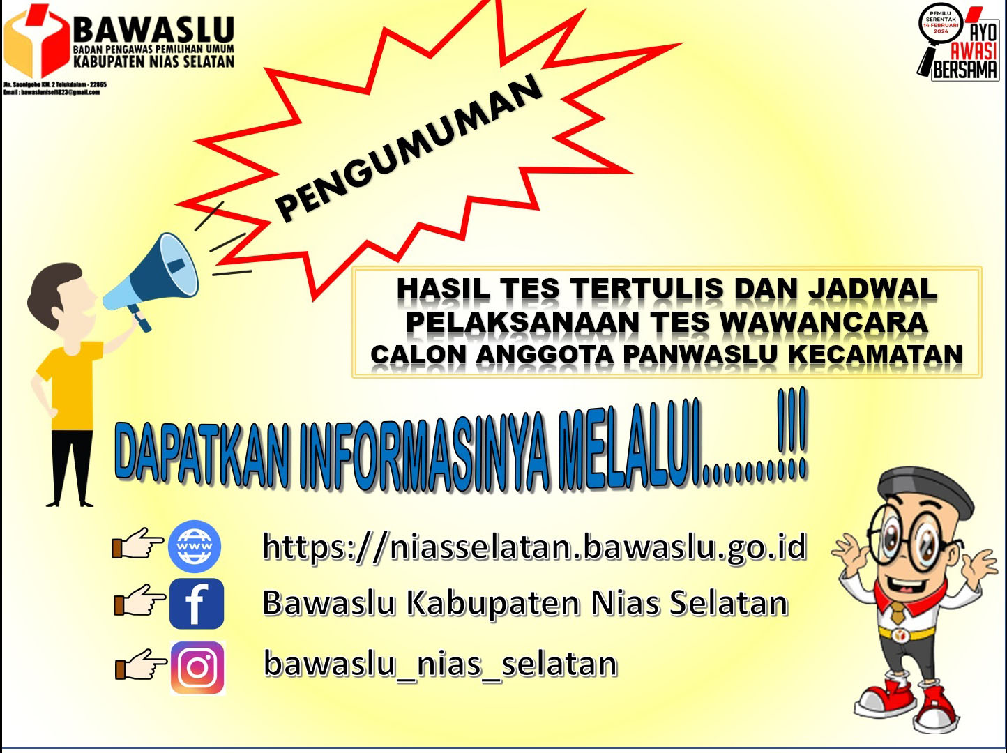 Teluk Dalam_Bawaslu Nisel - Mempedomani Surat Keputusan Ketua Badan Pengawas Pemilihan Umum Nomor: 354/HK.01/K1/10/2022 tentang Perubahan Keputusan Ketua Badan Pengawas Pemilihan Umum Nomor: 314/HK.01.00/K1/09/2022 tentang Pedoman Pelaksanaan Pembentukan Panitia Pengawas Pemilu Kecamatan Dalam Pemilu Serentak Tahun 2024, bahwa hasil seleksi tes tertulis Calon Anggota Panwaslu kecamatan diumumkan pada tanggal 18 Oktober 2022 (18/10/2022).