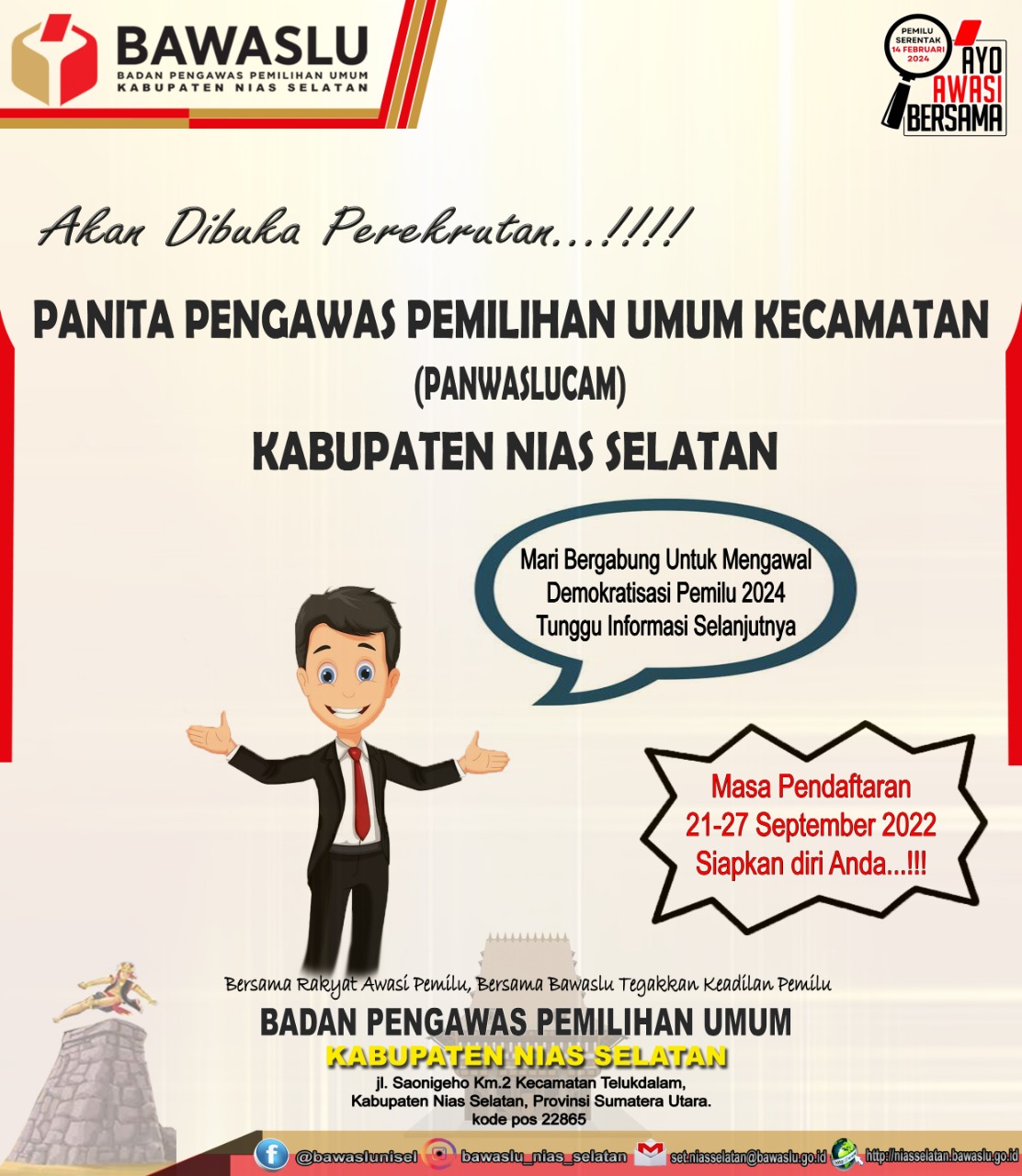 Bawaslu Kabupaten Nias Selatan akan membuka rekrutmen terbuka Panwaslu Kecamatan untuk mengawal demokratisasi Pemilu 2024. Pendaftaran dibuka mulai 21 - 27 September 2022.