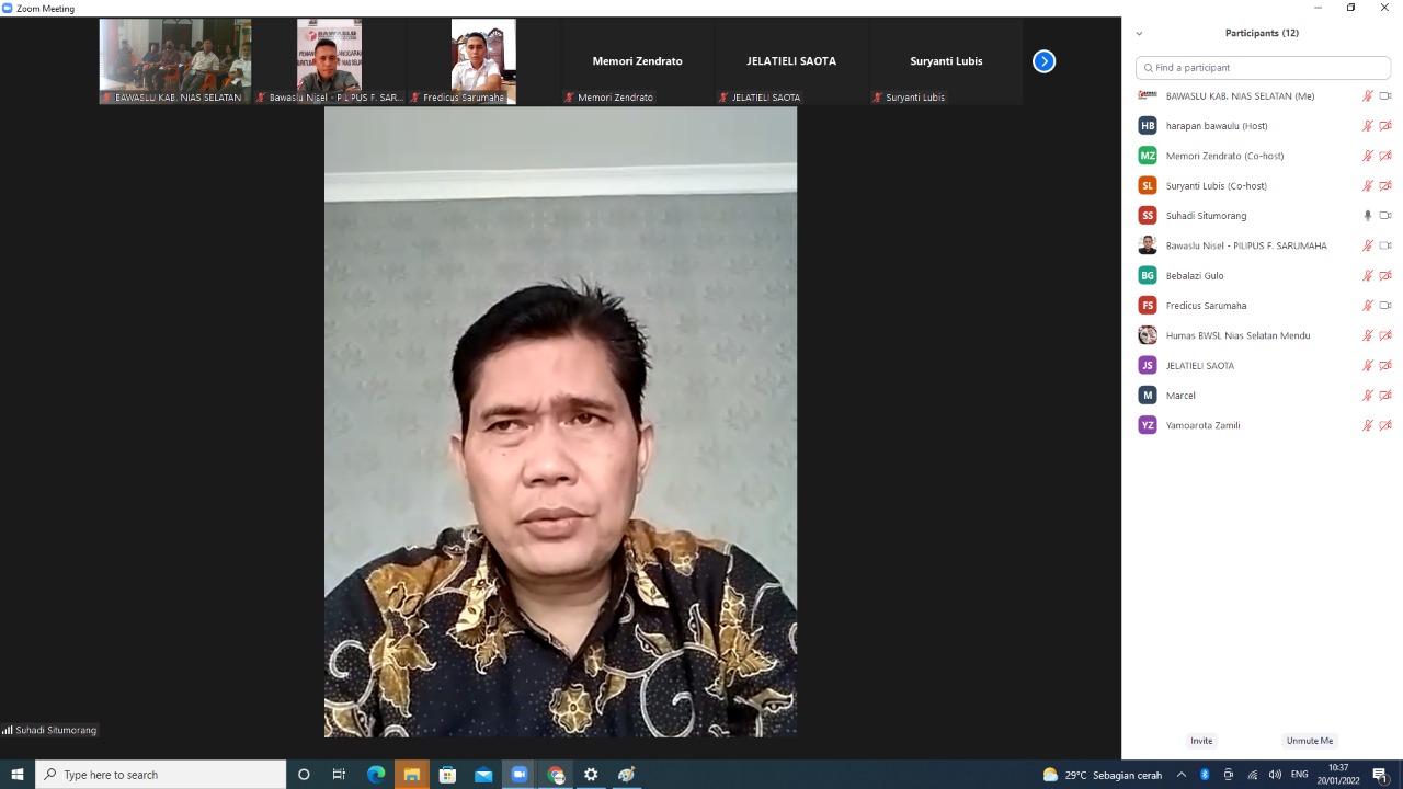 Telukdalam_Bawaslu Nisel-Anggota Bawaslu Sumatera Utara Koordinator Divisi Pengawasan dan Hubungan Antar Lembaga (PHL) Suhadi Sukendar Situmorang menekankan kepada seluruh staf untuk memiliki mental yang kuat sebagai bagian dari pengawas pemilu. Hal itu disampaikannya saat memaparkan materi ketika menjadi narasumber pada pelatihan Staf Bawaslu Kabupaten Nias Selatan dengan topik Strategi, Prosedur dan Kode Etik Staf Sekretariat Pengawas Pemilu dalam tugas pengawasan pada Kamis (20/1/2022).