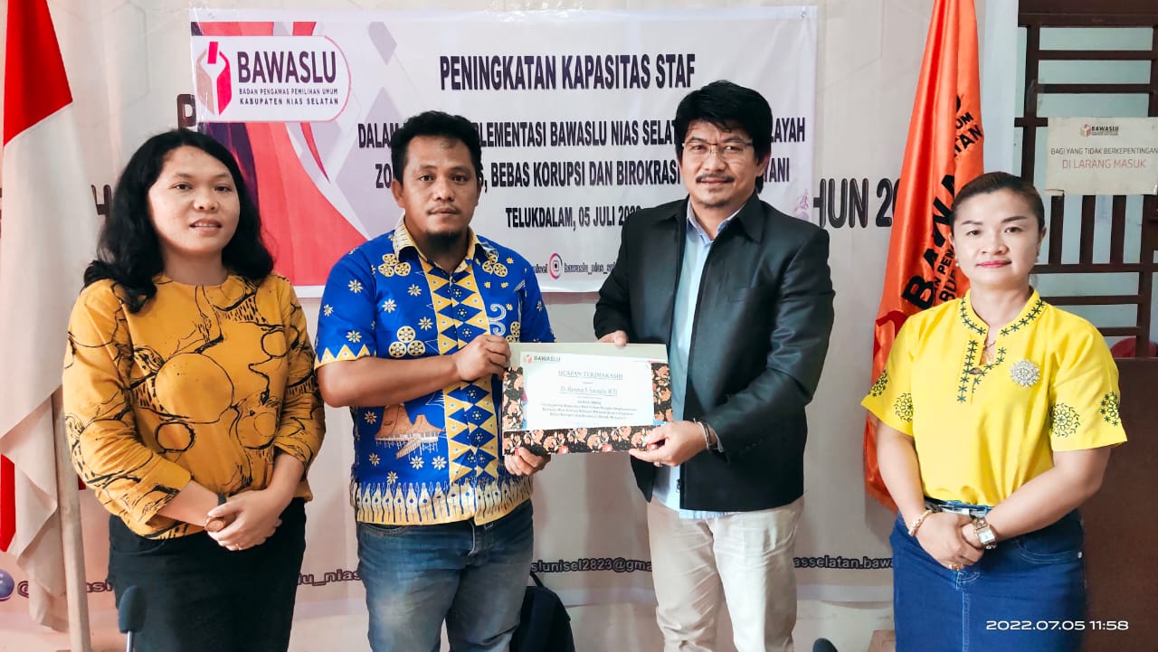 Foto: Penyerahan Penghargaan Oleh Ketua Bawaslu Nias Selatan Kepada Narasumber Rektor Universitas Nias Raya (UNIRA) Dr. Martiman S. Sarumaha, M.Pd dan dipangingi oleh Anggota dan Plt. Kasek Bawaslu Niase Selatan pada pelatihan dengan tema Peningkatan Kapasitas Staf dalam rangka implementasi Bawaslu Nias Selatan menjadi Zona integritas, bebas korupsi dan birokrasi bersih melayani yang dilaksanakan di Kantor Bawaslu Kabupaten Nias Selatan, Jln.Saonigeho Telukdalam (05/07/2022).