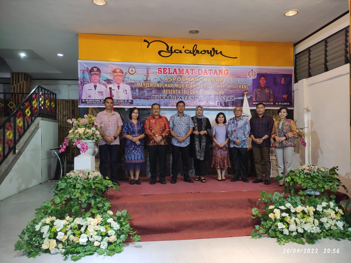Teluk Dalam_BawasluNisel - Bertempat di Pendopo Bupati Nias Selatan, Asisten Potensi Maritim (Aspotmar) Kasal Mayjend TNI (Mar) Nur Alamsyah, SE.,M.M.,M.Tr (Han) bersama Istri dan rombongan yang didampingi oleh Danlanal Nias Letkol Laut (P) Jerry Henry Manuhutu, M.Tr.Hanla.,CRPM disambut oleh Wakil Bupati (Wabup) Nias Selatan Firman Giawa, SH.,MH bersama Sekretaris Daerah Ir. Ikhtiar Duha, M.M, Staf Ahli, Asisten, FORKOPIMDA, para Kepala OPD dan para pejabat Lanal Nias, serta dari Bawaslu Kabupaten Nias Selatan dihadiri oleh Kepala Sekretariat Bawaslu Kabupaten Nias Selatan Sarso F. Sarumaha, S.Sos, Senin (26/9/2022).
