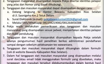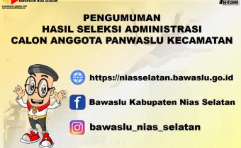Berdasarkan pengumuman Bawaslu Kabupaten Nias tanggal 12 Oktober 2022 Nomor: 004/KP.01.00/POKJA/SU-14/10/2022 tentang Pengumuman Hasil Seleksi Administrasi Calon Anggota Panwaslu Kecamatan Dalam Pemilu Serentak Tahun 2024, maka bersama ini disampaikan beberapa hal sebagai berikut: