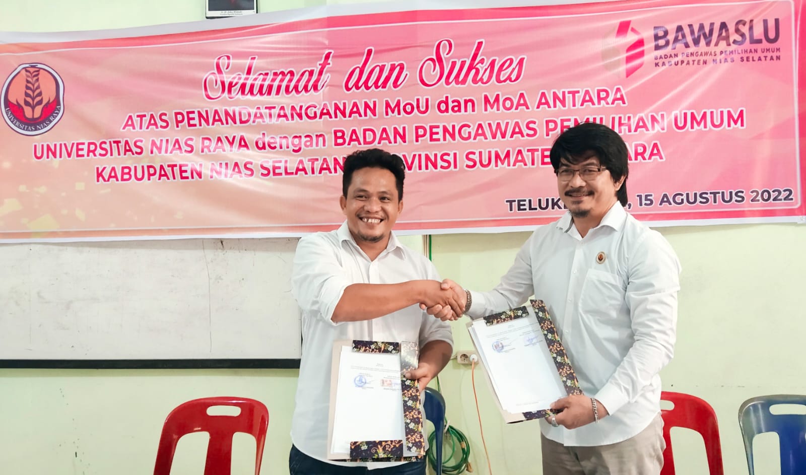 Foto: Ketua Bawaslu Nias Selatan (Harapan Bawaulu, S.E., MM bersama Rektor UNIRAYA (Dr. Martiman S. Sarumaha, M.Pd)