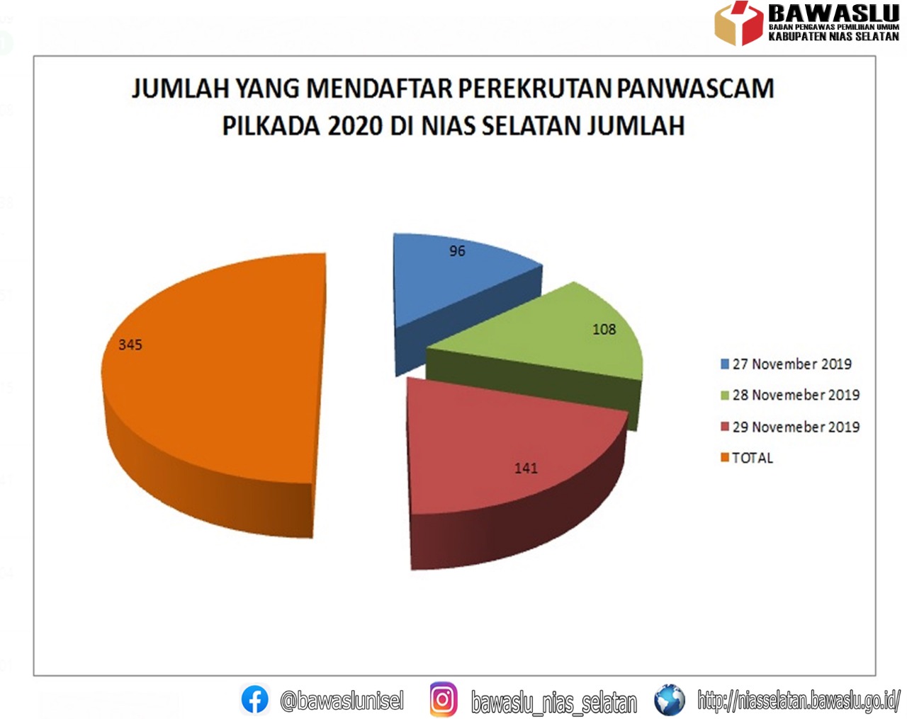 Bawaslu, Nisel - Hari ketiga pendaftaran Panwascam di Kabupaten Nias Selatan meningkat drastis dari dua hari sebelumnya, dimana hari pertama hanya 96 orang pelamar, hari kedua 108 pelamar, di hari ketiga pelamar membengkak menjadi 141 orang yang tersebar dari 35 kecamatan di Kabupaten Nias Selatan.